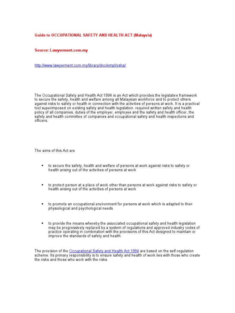 Akta keselamatan dan kesihatan pekerjaan 1994) is a piece of malaysian legislation which was gazetted on 25 february 1994 by the malaysian parliament.