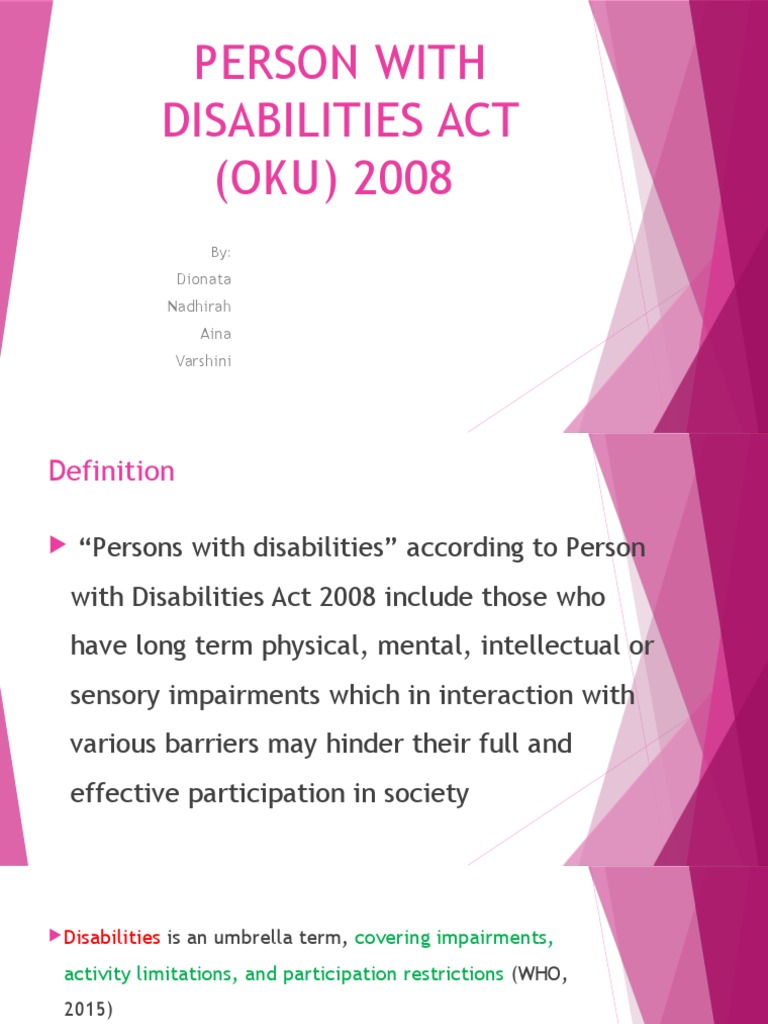 Persons With Disabilities Act 2008 / It means only that a person is an individual with a disability entitled to the protections of the ada or rehabilitation act.. The persons of disabilities act 2008 defines persons of disabilities as: Alternative grounds for designation under section 2 of act. This is act 685 of malaysia on persons with disabilities. The right of persons with disabilities to social protection is recognized by the 1948 universal declaration of human rights (udhr), the 1966 international covenant on economic, social and cultural rights (icescr) and, more specifically, the 2006 un convention on the rights of persons. Learn vocabulary, terms and more with flashcards, games what is a individual with a disability?